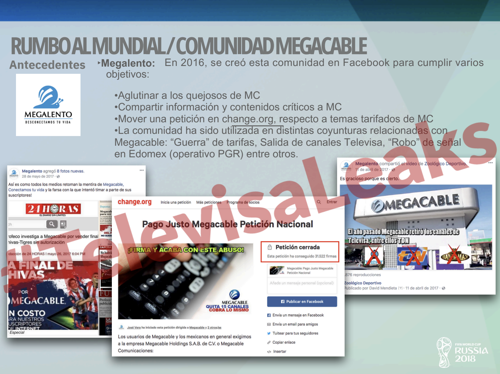 Cinco meses antes del mundial de Rusia 2018, Televisa activó su equipo de operaciones negras contra Megacable. En un documento marcado como “confidencial”, localizado en los cinco terabytes filtrados a Aristegui Noticias, se expone la estrategia ‘Rumbo al mundial’ que la productora de contenido más grande del mundo hispano siguió en contra de su competidora.