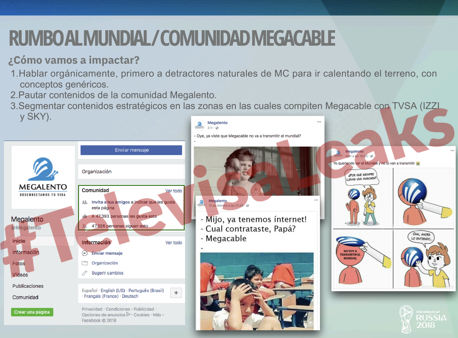 Además, durante el operativo ‘Rumbo al mundial’ se activó en tres ocasiones “la comunidad Megalento”, una página de Facebook controlada por Televisa. Esto dice el documento marcado como ‘confidencial’ sobre Megalento: