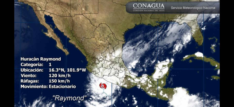 El huracán ‘Raymond’, categoría 1 se mantiene “semi estacionario” frente a costas de Guerrero y Michoacán, reportó esta madrugada el Servicio Meteorológico Nacional. A las 04:00 de este miércoles se encontraba a 190 km del sur de Zihuatanejo, Guerrero, y se aleja lentamente hacia el Pacífico, reportó el SMN de la Conagua.