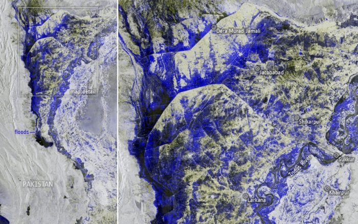 La misión también fue utilizada para mapear el alcance de las inundaciones que actualmente están devastando Pakistán. Las fuertes lluvias monzónicas, diez veces más intensas de lo habitual, desde mediados de junio han provocado que más de un tercio del país se encuentre actualmente bajo el agua. Las lluvias torrenciales han cobrado la vida de más de 1,100 personas y más de 33 millones se han visto afectadas.