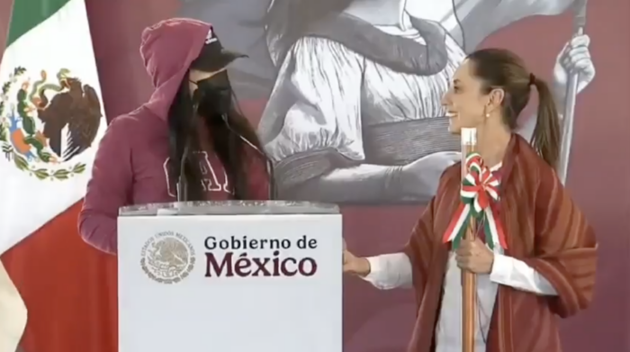 En el templete, la joven saxofonista se dirigió a la mandataria federal: