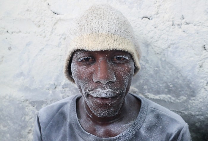 Colores que contrastan con su medio ambiente. Un retrato de Silas Owiti, artesano keniano que elabora souvenirs hechos a mano y trabaja reciclando huesos de animales para elaborar piezas de joyería en un taller en Kibera, un sitio en Nairobi, capital de Kenia en África. El polvo que lo que cubre todo y parecería nieve se desprende de los huesos mientras se hace el trabajo de tallado y pulido. Así, expandiéndose por toda la estancia, se posa en la ropa y piel de los artesanos en el taller.