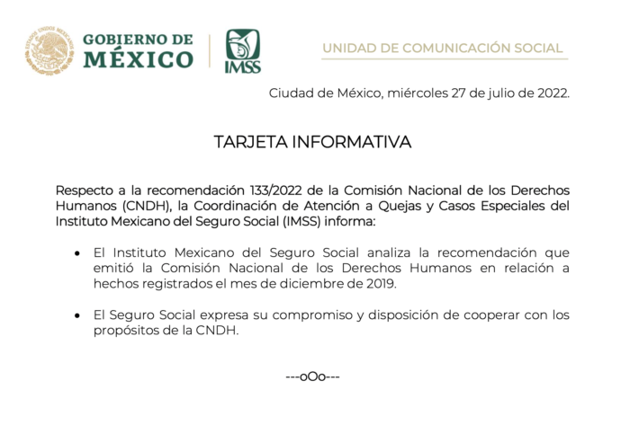 Ante esto, la Comisión Nacional solicitó al IMSS que se repare integralmente a la víctima indirecta. Por su parte, el Instituto informó que “analiza la recomendación que emitió la Comisión Nacional de los Derechos Humanos en relación a hechos registrados el mes de diciembre de 2019″.