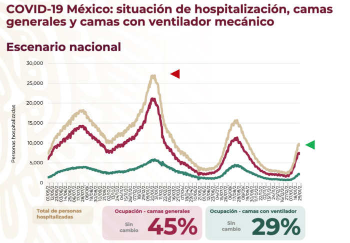 Al momento hay 45 por ciento de ocupación hospitalaria en las camas de hospitalización general, en el mismo nivel que este sábado. En las camas con ventilador la ocupación es de 29 por ciento.
