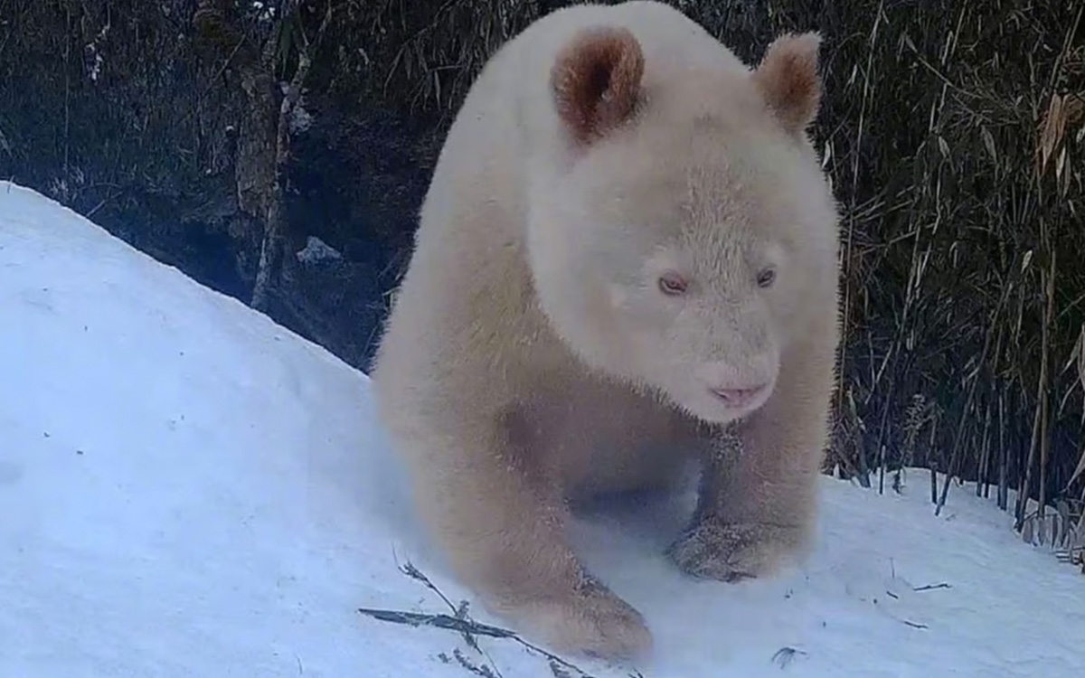 Sin las características manchas negras en el pelaje y con un par de ojos rojos, el panda gigante fue captado por las cámaras infrarrojas de la reserva ubicada en la provincia de Sichuan.