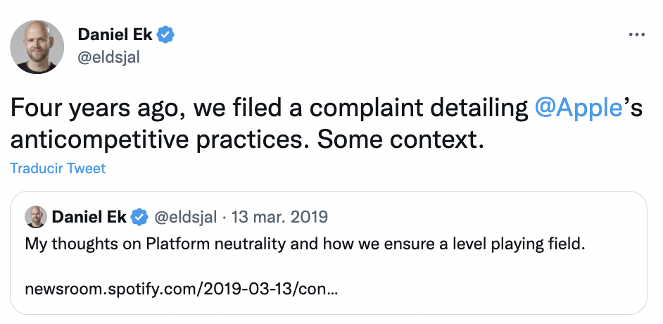 El presidente ejecutivo de Spotify, Daniel Ek, volvió a la carga con sus ataques contra Apple, alegando en una serie de tuits que el fabricante del iPhone “se da a sí mismo todas las ventajas mientras sofoca la innovación y perjudica a los consumidores”.