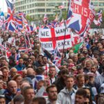 Los seguidores de "Unir el reino", que formaron un río de banderas británicas e inglesas por las calles, portaron pancartas que decían "detener las pateras" y "devolverlos a casa".